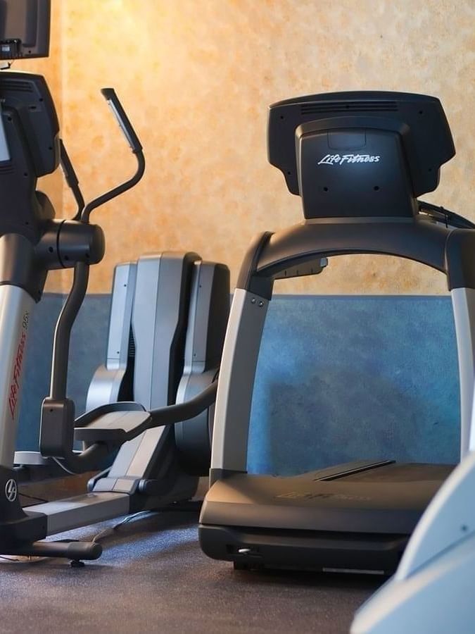Manténgase activo en cualquier momento con nuestro gimnasio abierto las 24 horas, equipado con pesas libres, cinta de correr y escaladora, todo ello disponible para uso ilimitado de los huéspedes.
